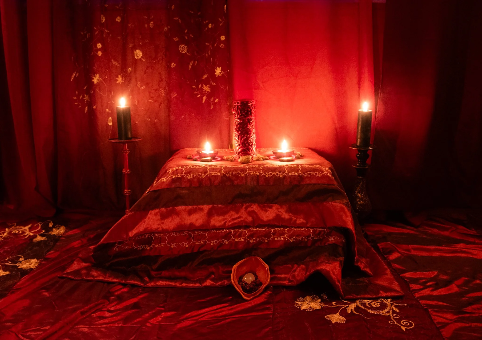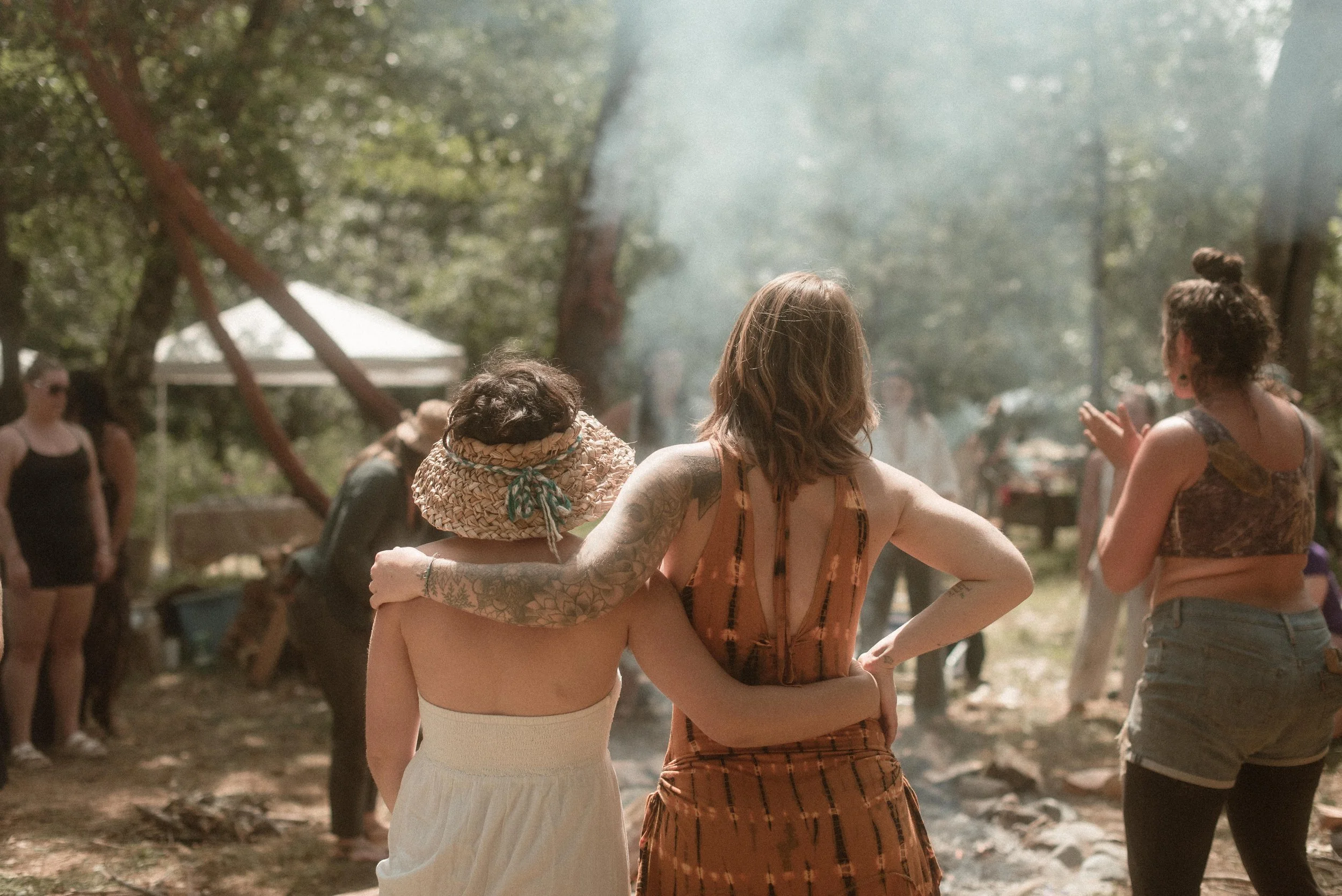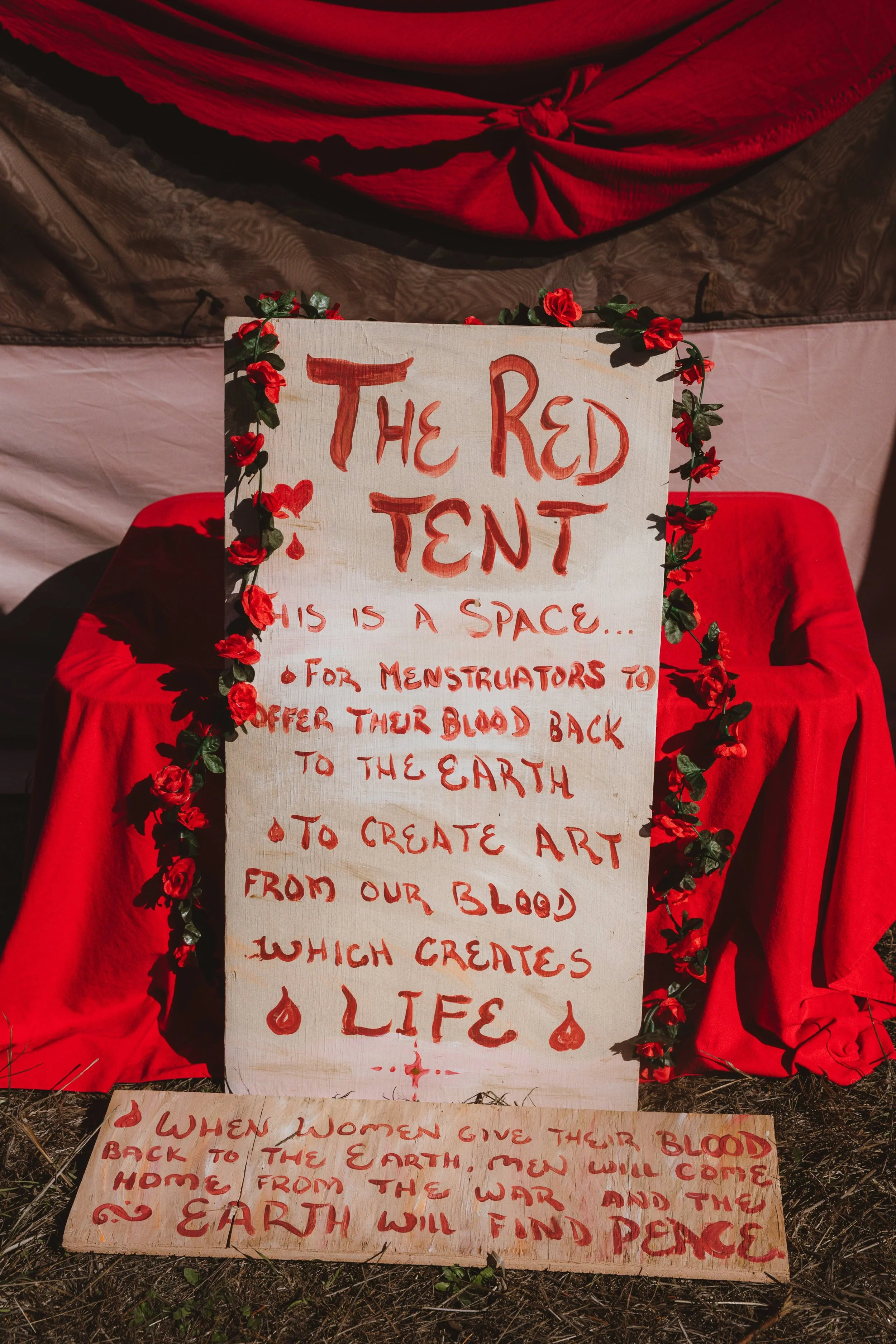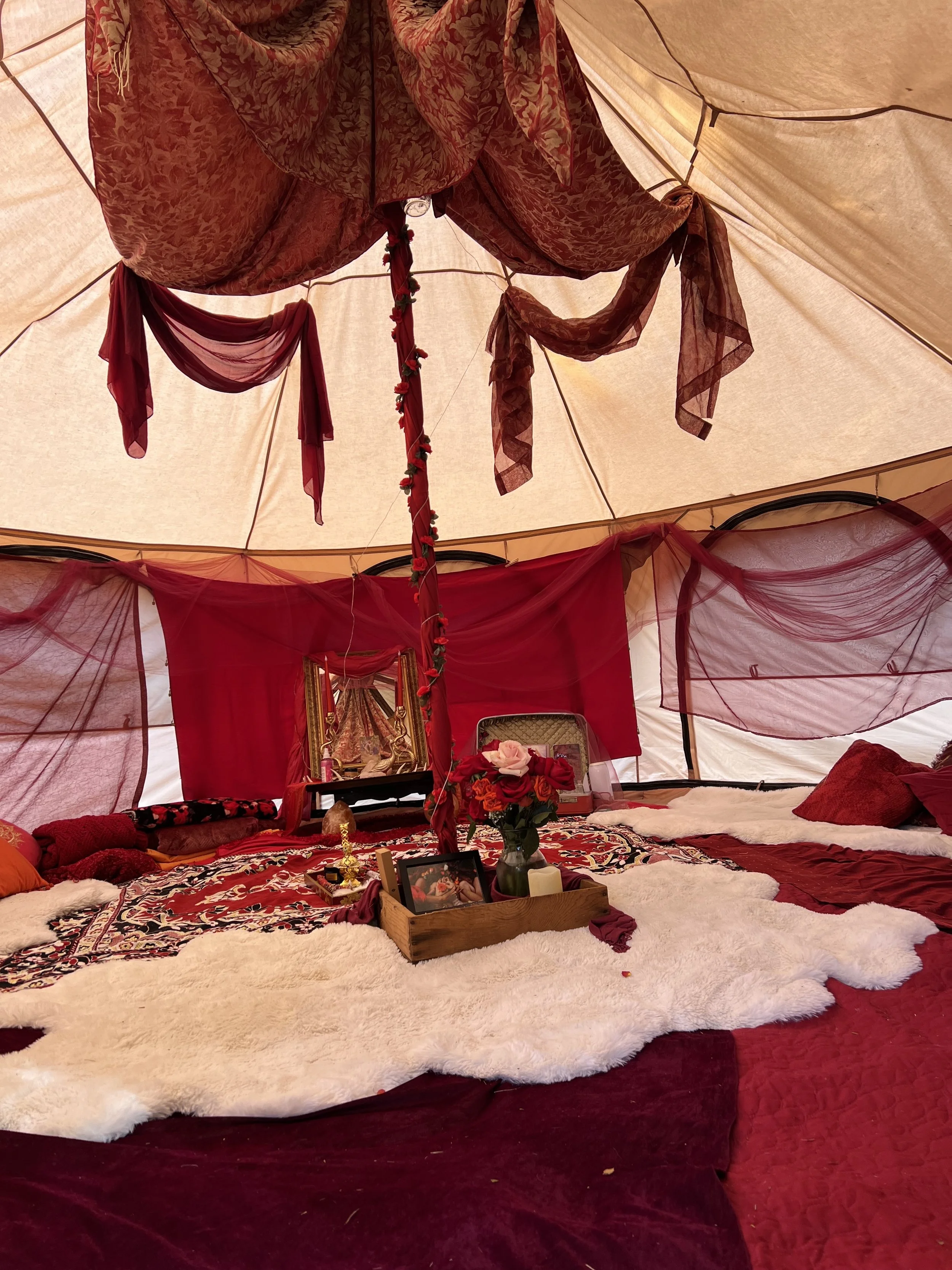 The Red Tent offers a place for women and cyclical beings to honor their bodies, share stories, and return to their natural rhythm amidst the fast paced and excitement of celebration.